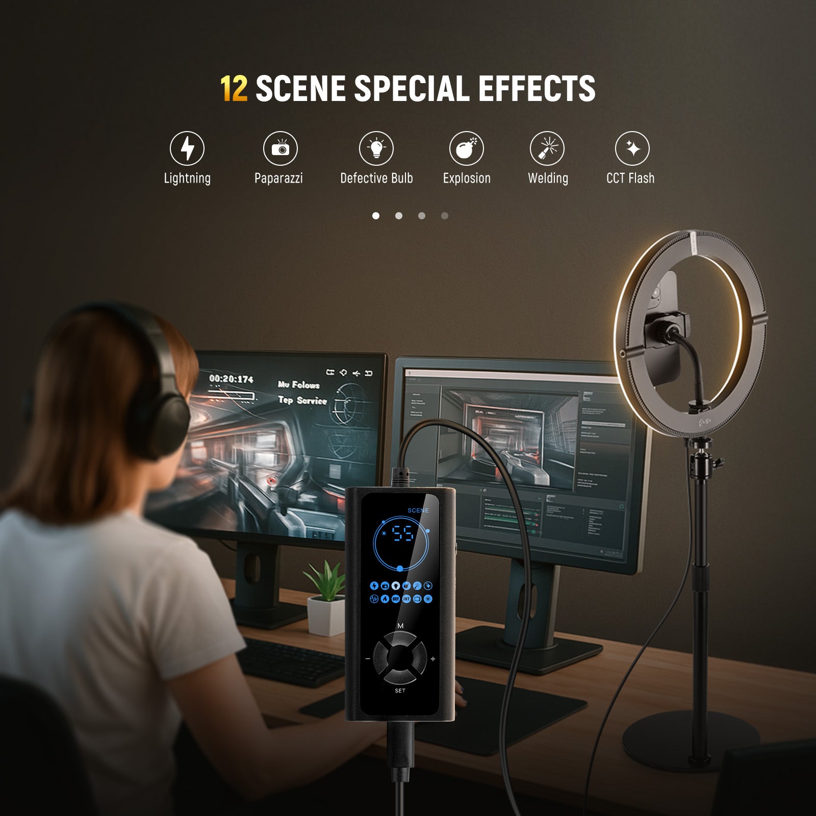 - Modalità CCT dimmerabile e 12 effetti scena - La modalità CCT offre un'illuminazione calda e fredda da 2900K a 7000K insieme a un oscuramento da 0 a 100%. L'illuminazione regolabile in luminosità valorizza tutti i toni della pelle e riduce al minimo le imperfezioni. La modalità FX ha integrato 12 effetti scena realistici per riprese video professionali, come Paparazzi, Lampadina difettosa ed Esplosione. È incluso un telecomando RT116 per abilitare i selfie del telefono da remoto tramite connessione Bluetooth