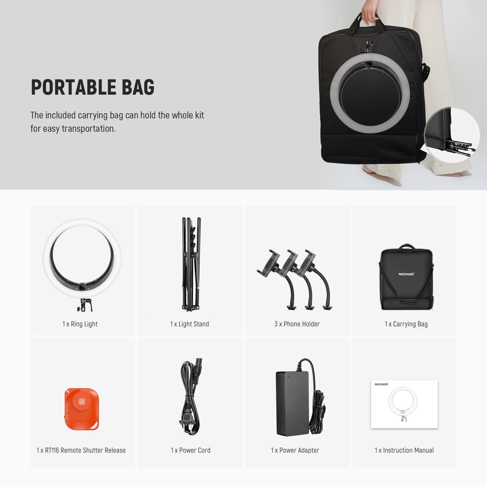 - Supporto per lampada reversibile e pieghevole : il supporto per lampada in dotazione con un intervallo di regolazione dell'altezza di 67-180 cm può posizionare la luce sopra la testa o all'altezza degli occhi. Le gambe del supporto possono piegarsi verso l'alto e adattarsi all'interno della borsa per il trasporto per riporre e trasportare facilmente