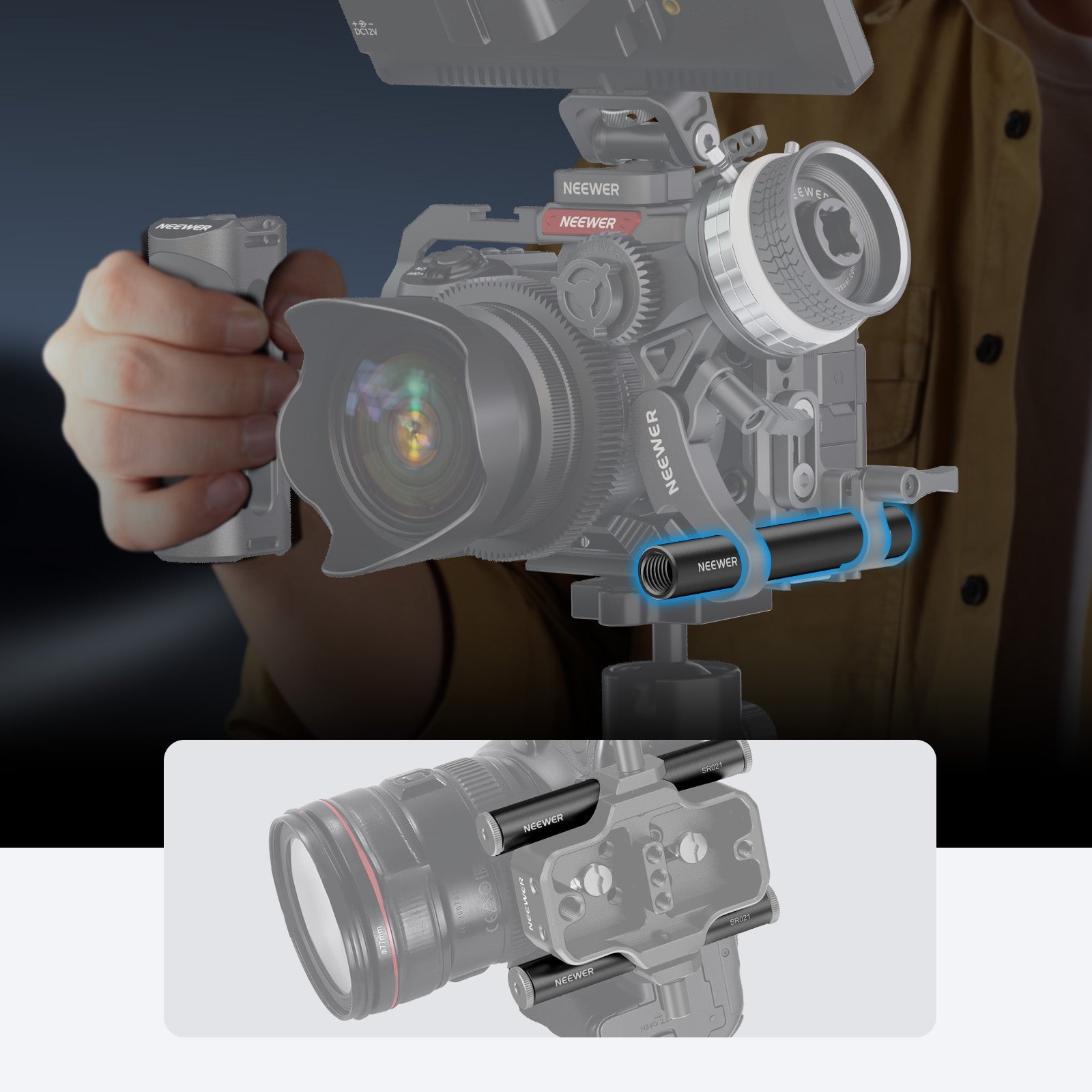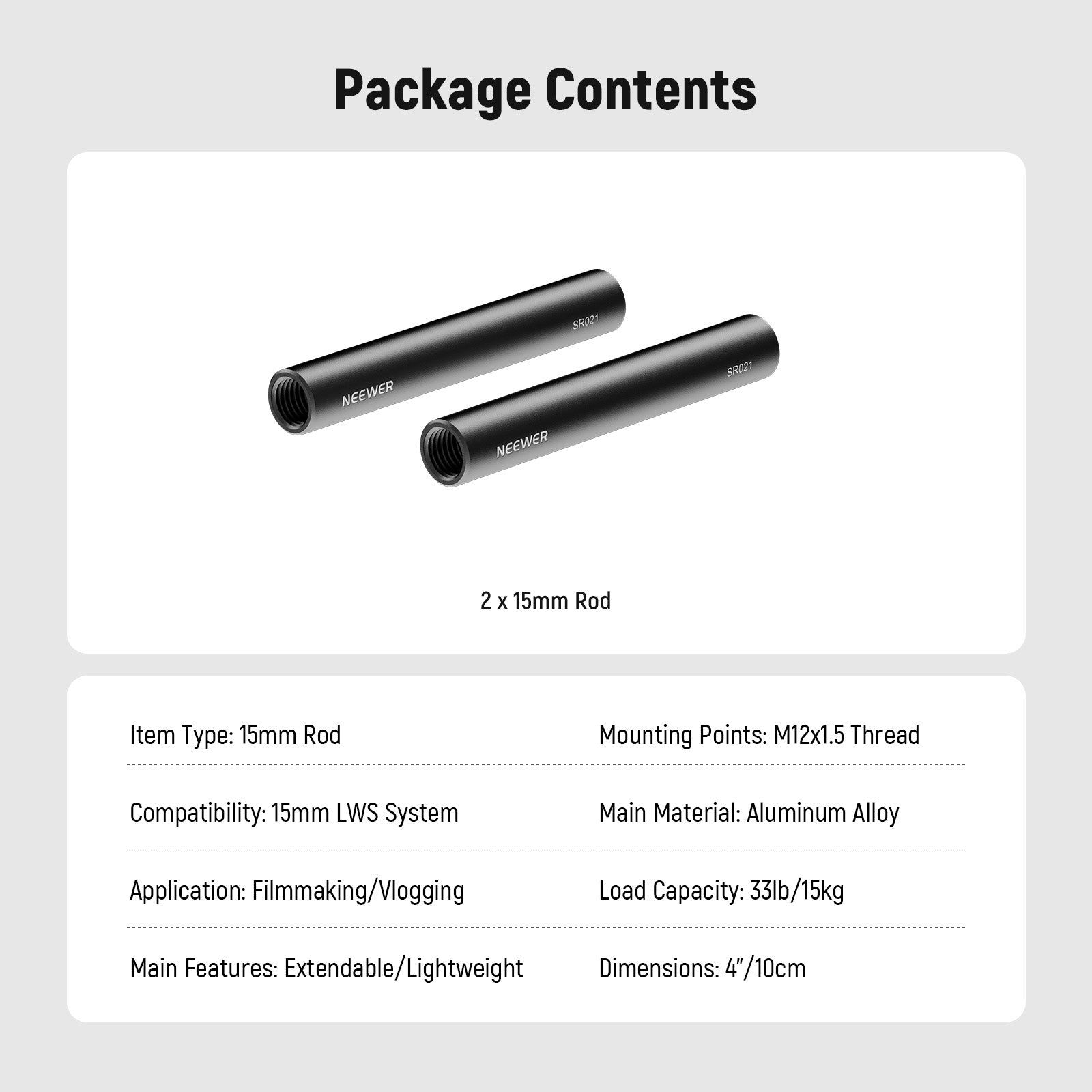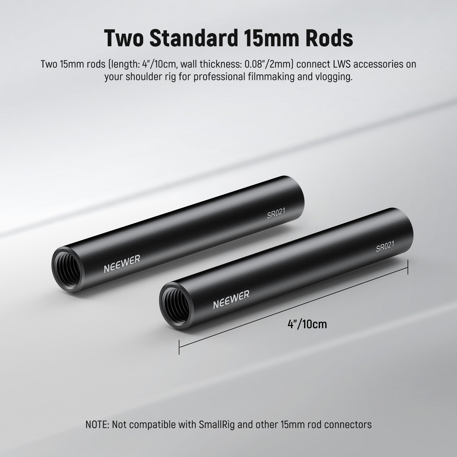 • Due aste standard da 15 mm - Due aste da 15 mm (lunghezza: 4"/10 cm, spessore parete: 0,08"/2 mm) collegano gli accessori LWS al tuo rig da spalla per riprese cinematografiche e vlog professionali. Compatibile con i rig video SmallRig e compatibile con i rig per telecamera NICEYRIG