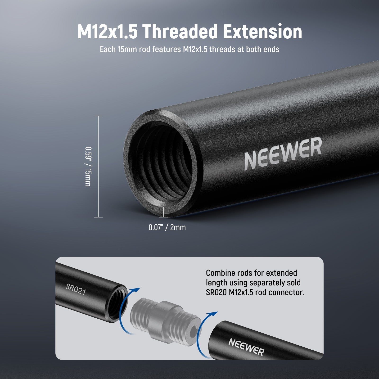 • Estensione filettata M12x1,5 - Ogni asta da 15 mm presenta filettature M12x1,5 su entrambe le estremità per l'estensione della lunghezza tramite i connettori per asta SR020 M12x1,5 venduti separatamente. Non compatibile con SmallRig e altri connettori per asta da 15 mm