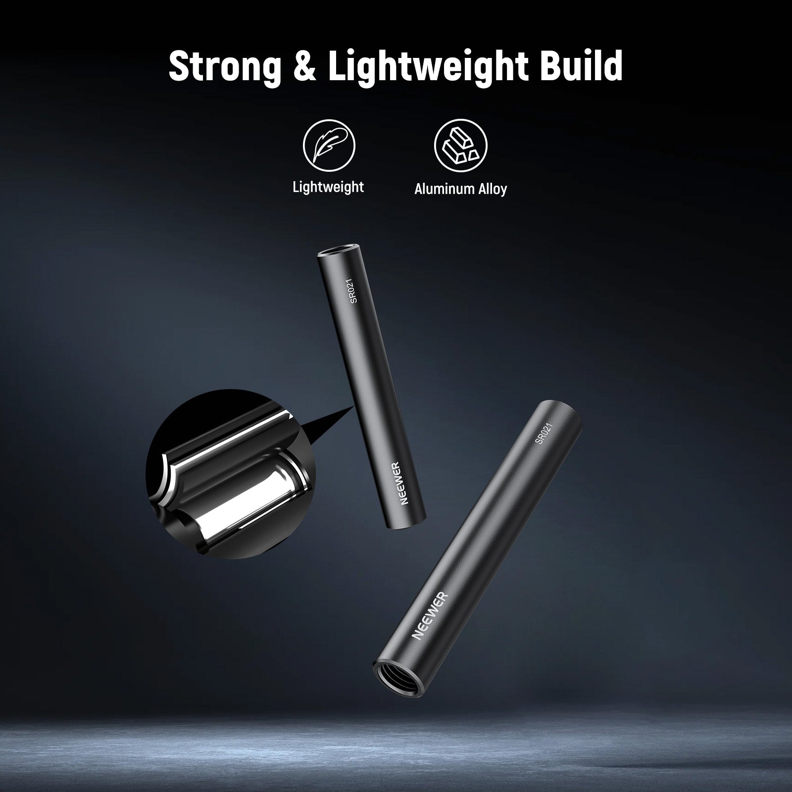 • Struttura robusta e leggera : realizzate in lega di alluminio anodizzato nero, le aste da 15 mm sono resistenti ai graffi, alla ruggine e alle deformazioni, ma sono leggere per l'uso portatile.