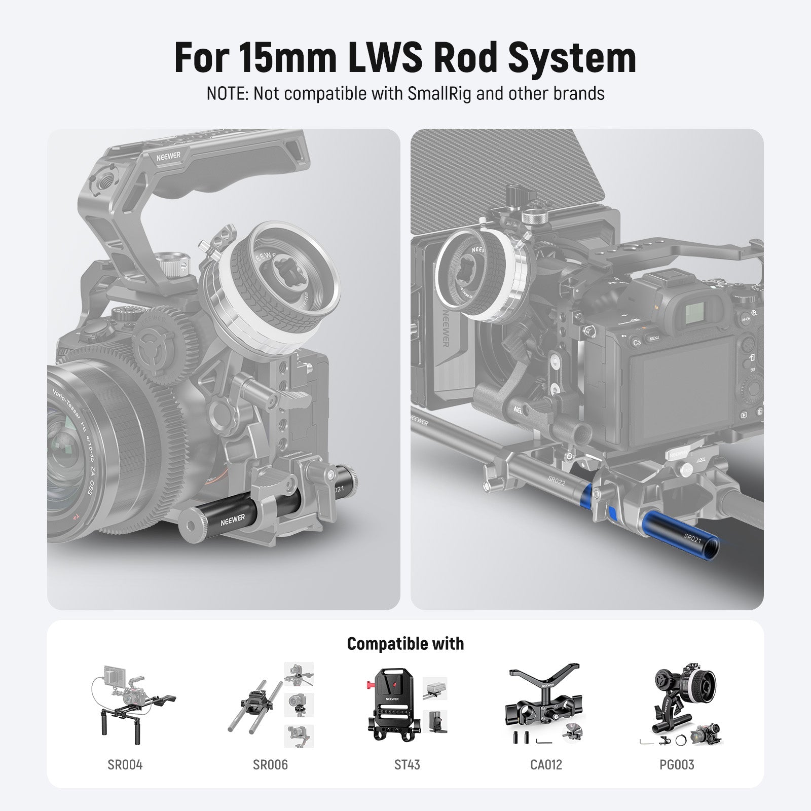 • Per sistema asta LWS da 15 mm - Compatibile con spallaccio NEEWER SR004, piastra di base SR006, matte box PG002, follow focus PG001/PG003, piastra batteria V Mount ST-43/PS007/VB-A1, supporto obiettivo CA012 e altre attrezzature LWS asta da 15 mm