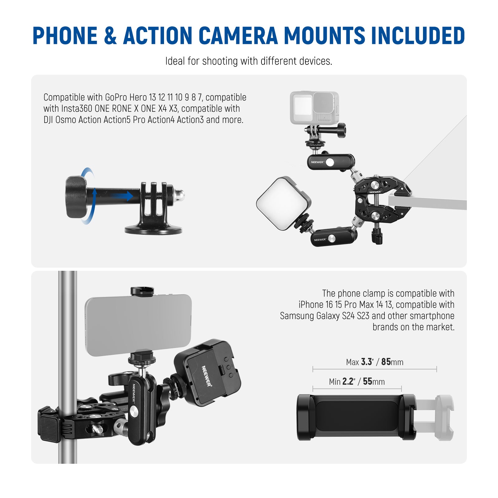 - Supporto per telefono e adattatore per action cam inclusi : il supporto per telefono regolabile da 2,1"-3,3"/54-85 mm è compatibile con iPhone 15 Pro Max 14 13, Samsung Galaxy S24 S23. L'adattatore per action cam è compatibile con GoPro Hero 12 11 10 9 8 7 Black, Go Pro Max, compatibile con Insta360 X4 X3, Insta 360 Ace Pro, compatibile con DJI Osmo Action 4 3, ecc. Sono disponibili anche diverse filettature da 1/4" e 3/8" e fori di posizionamento per ARRI, adatti anche per monitor da campo, luci video a LED, microfoni, ecc.
