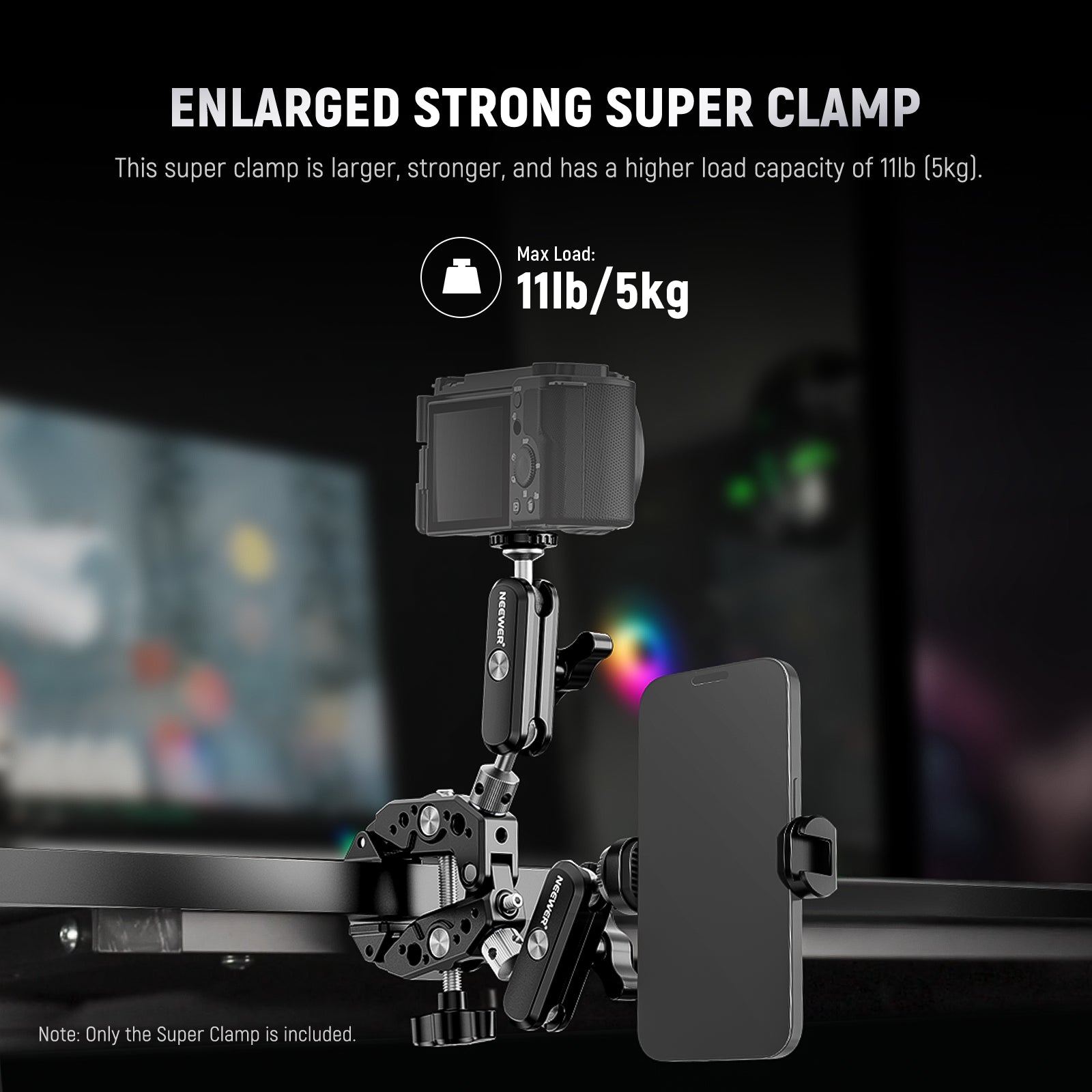 - Super morsetto robusto ingrandito : questo super morsetto ingrandito è stato migliorato con una capacità di carico elevata di 5 kg (11 libbre), supportando fotocamere DSLR, fotocamere mirrorless, monitor da campo, smartphone, action camera, luci video LED, webcam e altre apparecchiature o accessori, con un supporto per telefono extra e un adattatore di montaggio per action camera per una configurazione senza problemi, rendendolo una soluzione di montaggio versatile per fotografia, vlogging, streaming live, videoconferenze e altre riprese videografiche.
