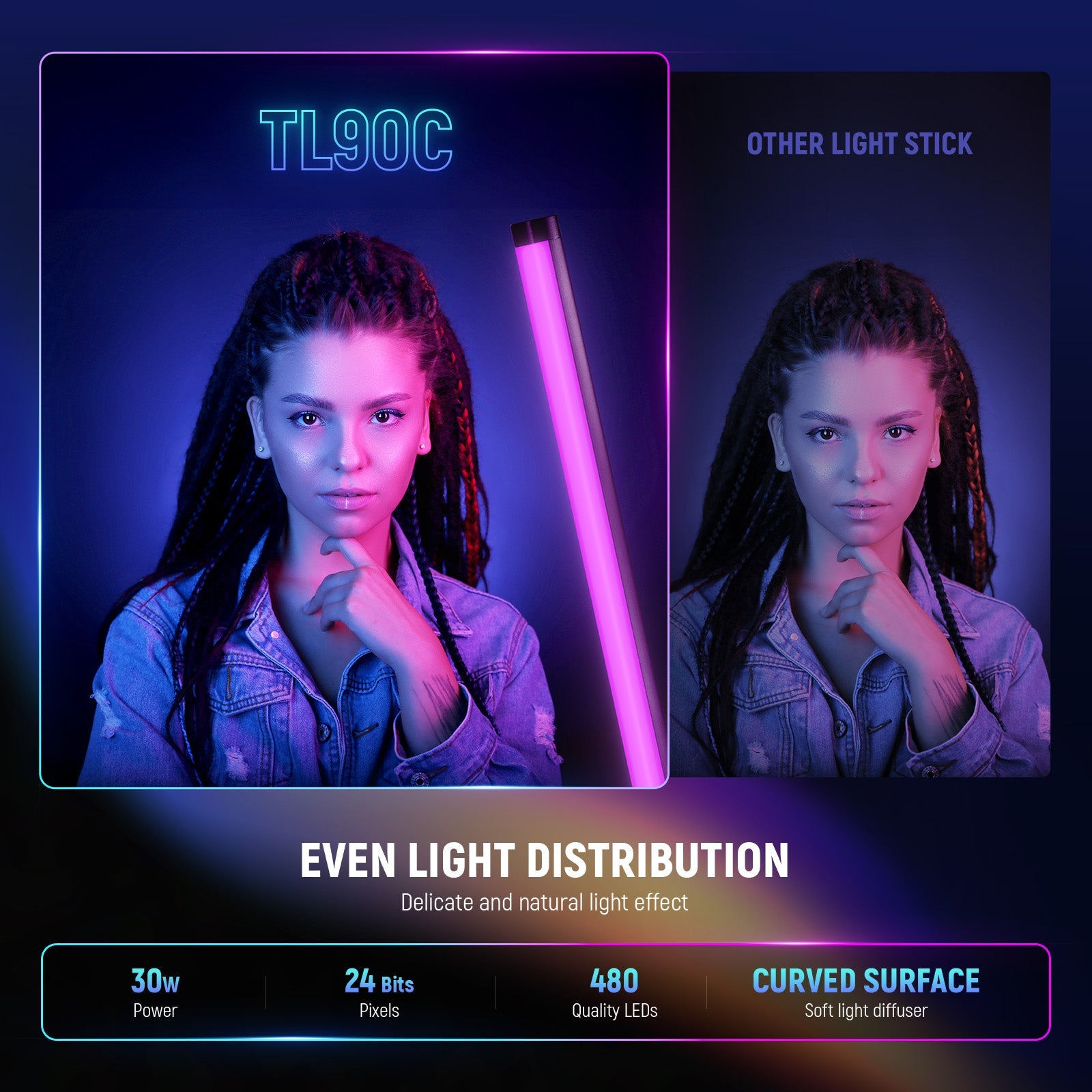 • Tubo luminoso a LED da 37" con miscelazione della luce RGBWW - Il TL90C, con una lunghezza estesa di 37,2"/94,5 cm, offre un'illuminazione fino a 1650 Lux/0,5 m, offrendo un'ampia copertura senza compromettere la portabilità. Questo stick luminoso da 30 W fornisce un'illuminazione morbida e uniforme con elevata fedeltà cromatica (CRI 97/TLCI 98) e un'ampia gamma di temperature di colore di 2500-10000 K. Dotato di tecnologia di miscelazione RGBWW, fornisce colori RGB completi, coprendo oltre il 90% dello spazio colore Rec. 2020 per dare forma a diverse atmosfere creative