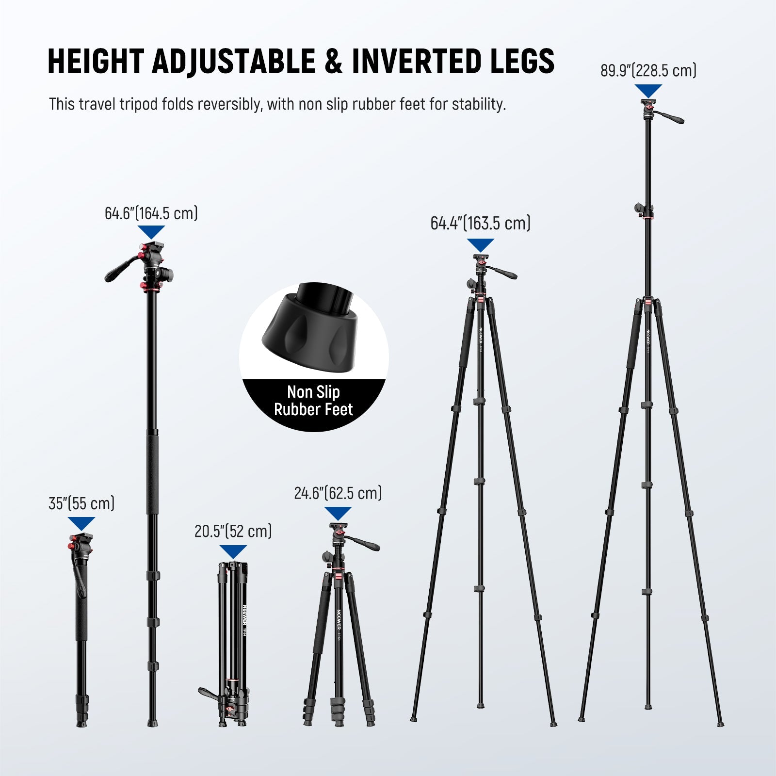 - Height Adjustable & Inverted Legs- Customize your shooting setup effortlessly with this travel tripod. It features three adjustable leg angles and a height range of 25.2 inches (64 cm) to 65 inches (165 cm), with a maximum height of 90.6 inches (230 cm) using the liftable center column. The tri pod legs fold in reverse for a compact size of 21 inches (53 cm), making it easy to attach to your backpack for outdoor photography. The non slip rubber feet provide stability on various surfaces
