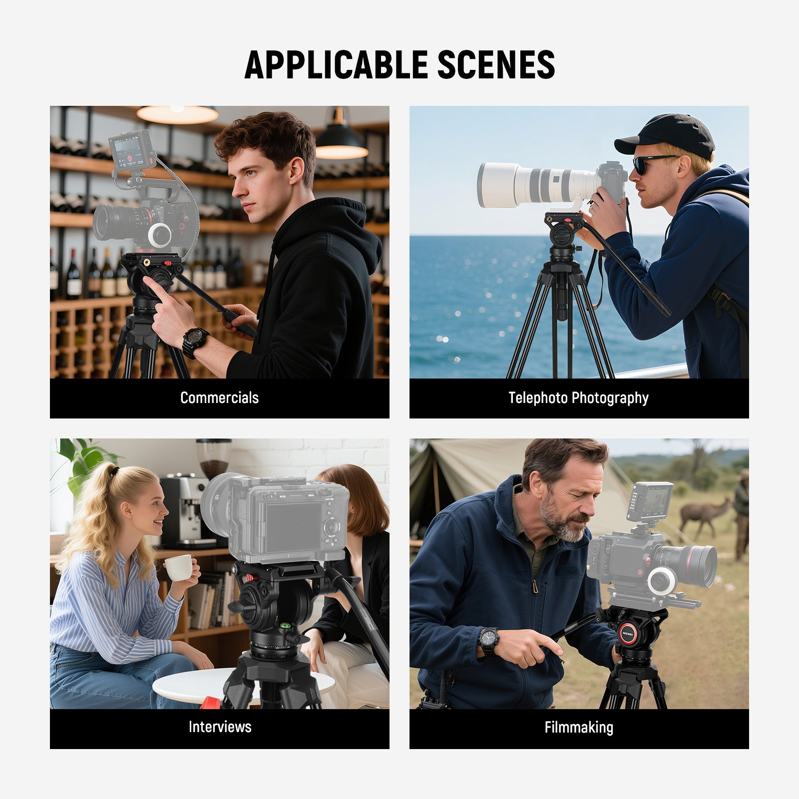- Premium Fluid Drag Pan Head- The video tripod features a fluid drag pan head, offers smooth friction damping, and supports 360° rotation with a tilt range of -75° to +90°, with a detachable handle for both left and right handed use. Its 75mm bowl base comes with a 360° scale for capturing sharp panoramic images, and includes a leveling handle and a built in bubble level for rapid leveling. The fluid head is also removable for other tripods with a 75mm base diameter