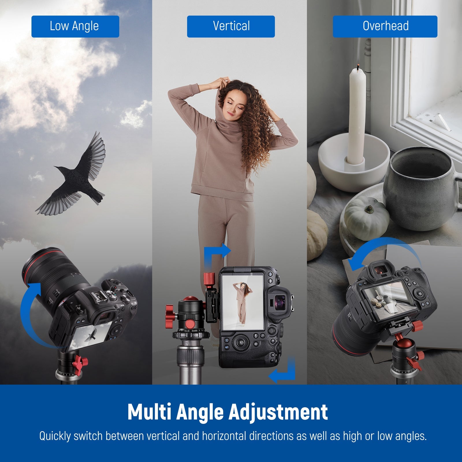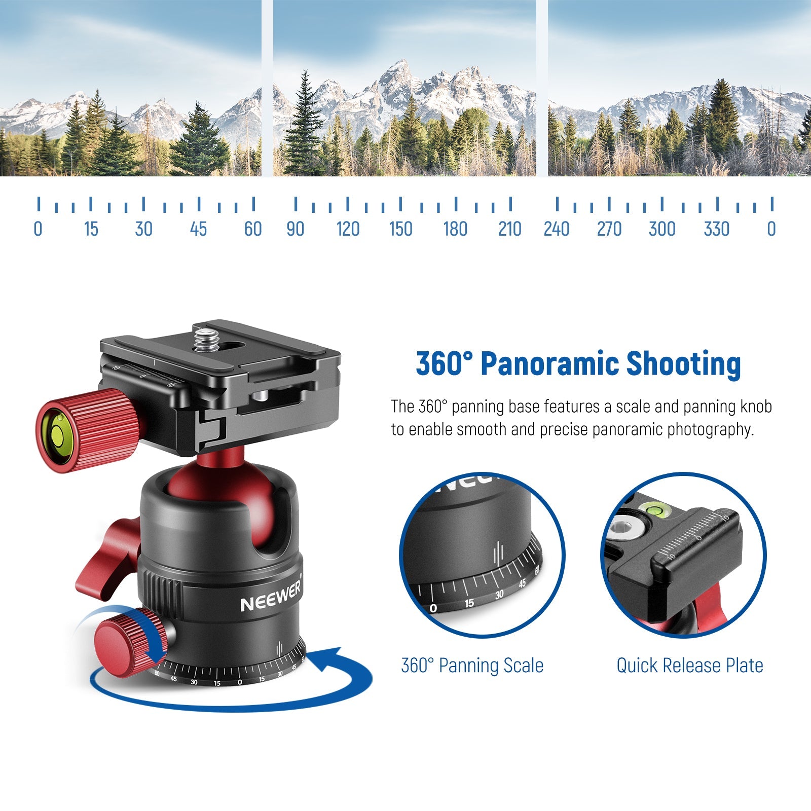 - Movimento flessibile con testa panoramica - Dotata di una scala panoramica a 360° con calibrazione precisa e blocco panoramica, questa testa per treppiede supporta la fotografia panoramica fissando la fotocamera a un treppiede. La testa a sfera girevole si inclina facilmente per riprese da diverse angolazioni, sia verticale, orizzontale o sopra la testa.