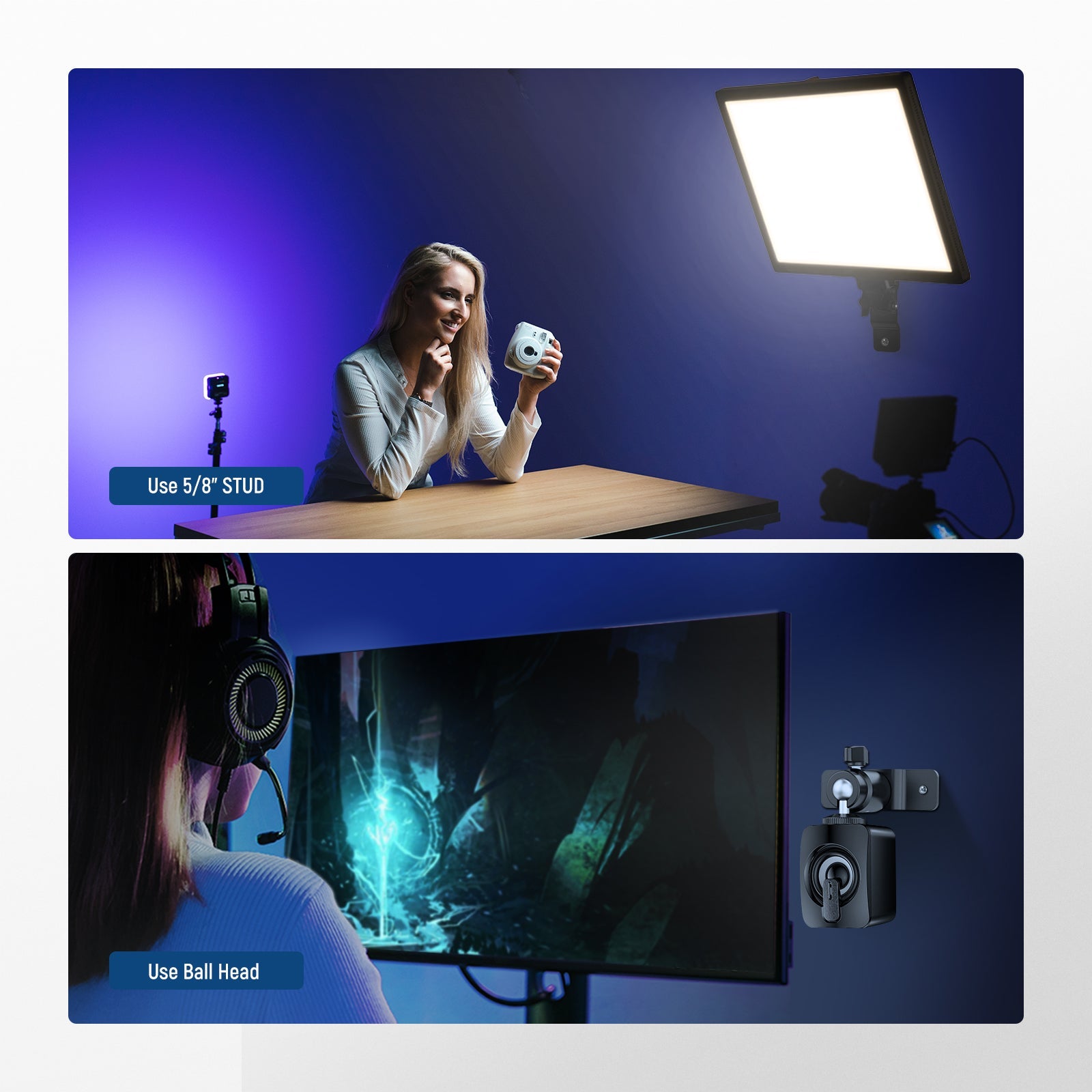 - Vite da 1/4" e perno da 5/8" : il supporto è dotato di un perno da 5/8" e di una vite da 1/4", che lo rendono compatibile con vari tipi di apparecchiature, tra cui luci ad anello, illuminazione da studio, luci video LED, flash stroboscopici , telecamere, monitor