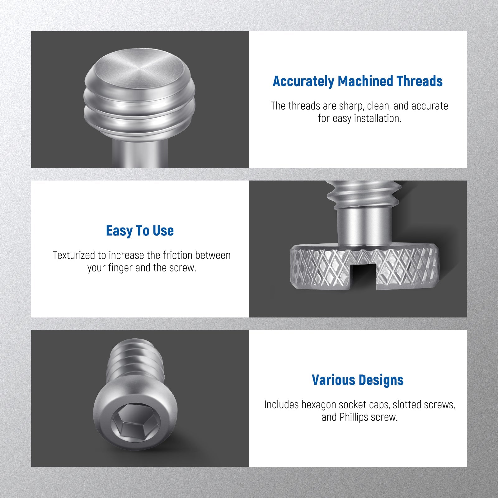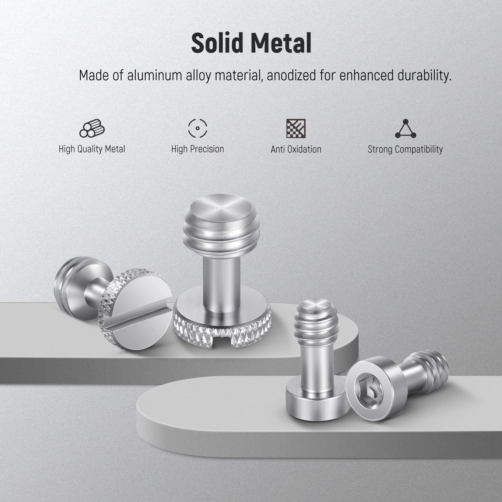 - Dimensioni delle viti precise e accurate : con misurazioni precise e tecnologia lavorata a CNC, le viti di diverse specifiche sono costruite con filettature precise. Ampiamente e perfettamente compatibile con gabbie per telefoni, gabbie per fotocamere, maniglie superiori per fotocamere, piastre a sgancio rapido e altro ancora