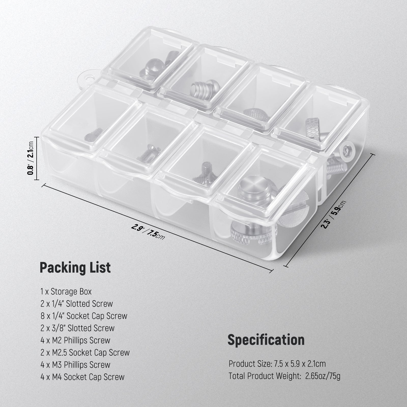 - Conservazione facile e sicura : è inclusa una scatola per il trasporto con 6 scomparti per riporre in sicurezza le viti in modo organizzato. Dopo l'uso, conservare le viti nella piccola scatola per il trasporto e trasportarle con facilità