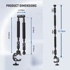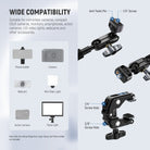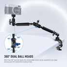 - Braccio articolato con teste a sfera - Il braccio a frizione a due sezioni offre una lunghezza estesa di 55 cm/22" ed è dotato di tre set di adattatori a doppia testa a sfera a 360°, che migliorano la flessibilità di angolo e altezza e si fissano con una semplice rotazione delle manopole di bloccaggio. Ogni testa a sfera è dotata di più anelli di gomma per afferrare saldamente la tua attrezzatura ed evitare cadute accidentali