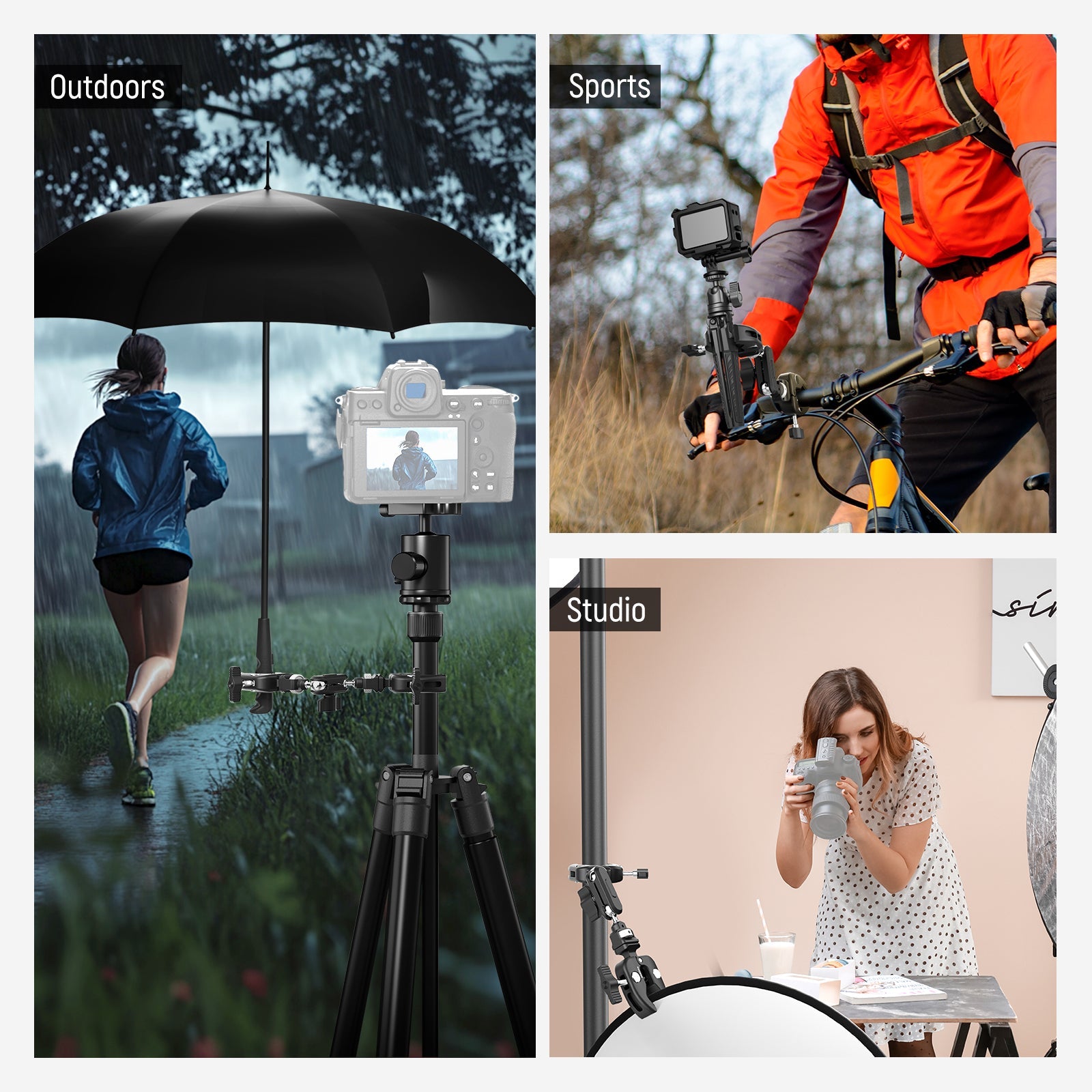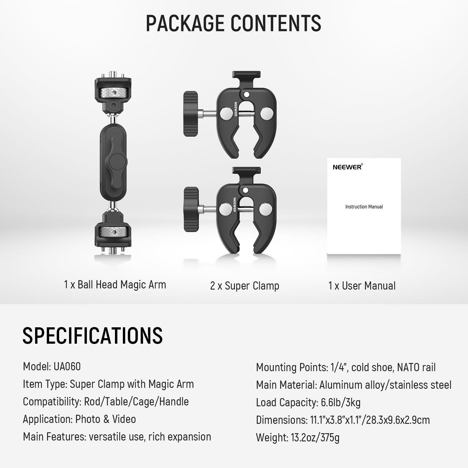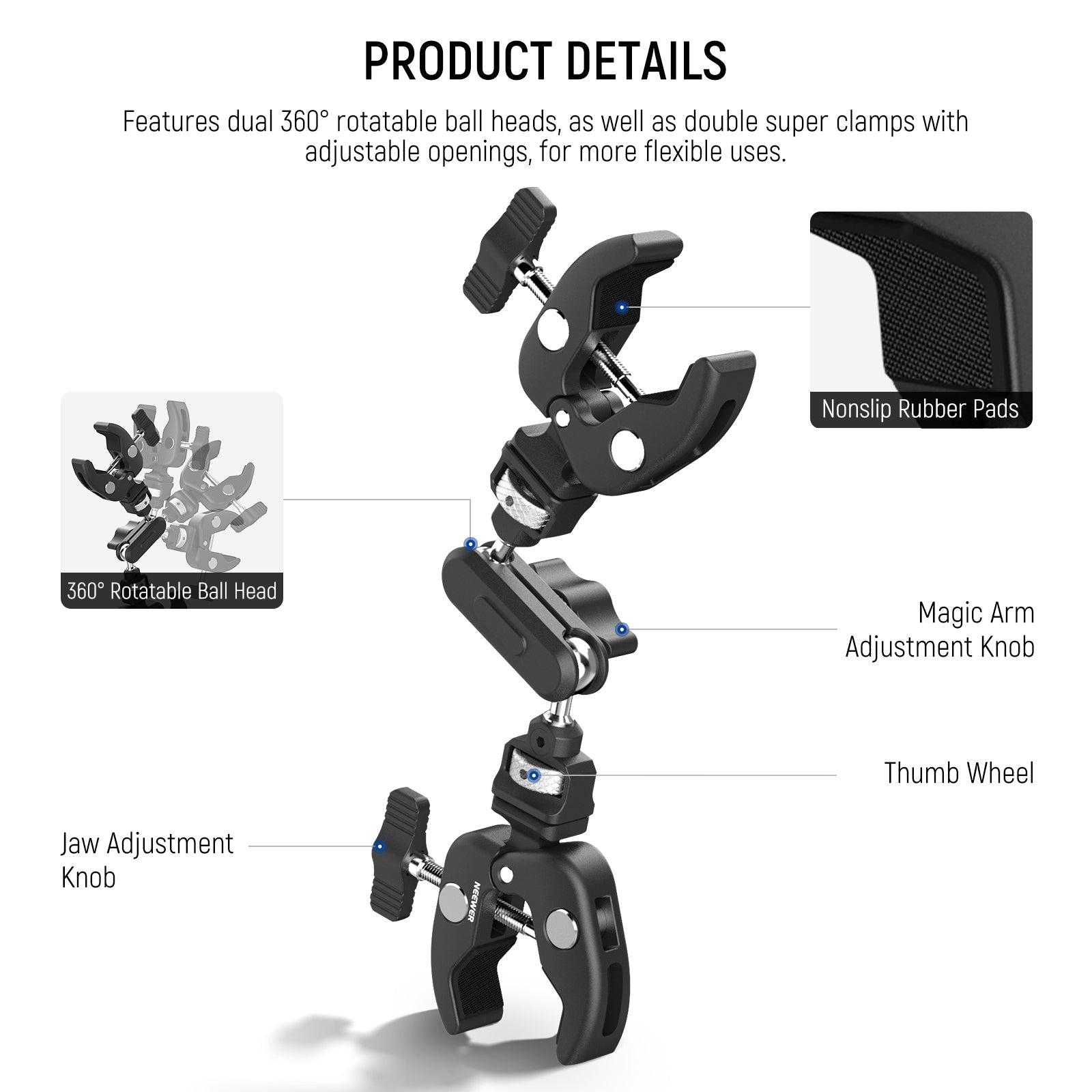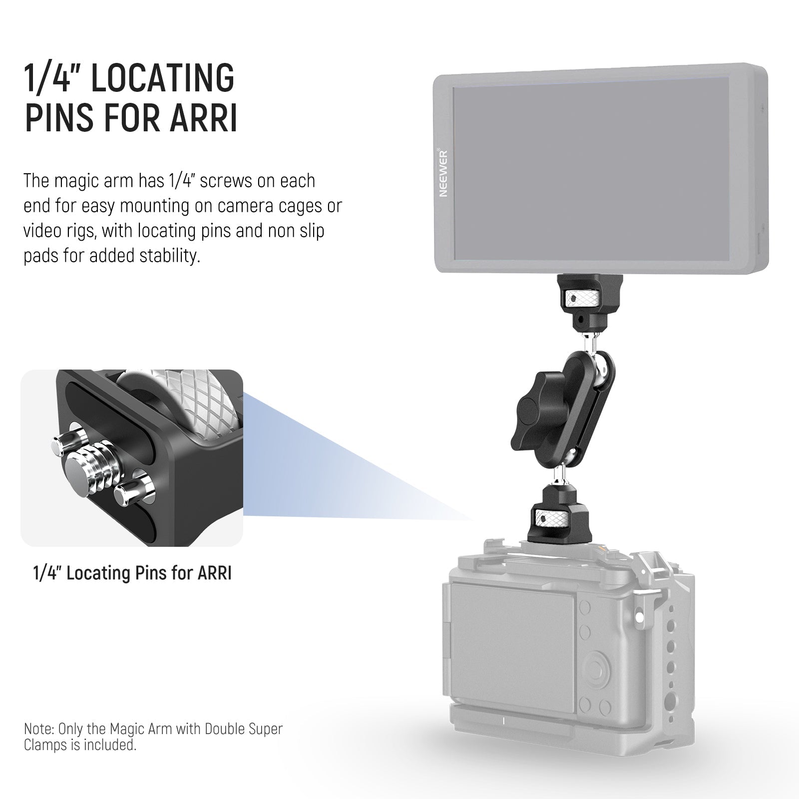 - Braccio Magico con Testa a Sfera e Super Morsetti - Il Braccio Magico NEEWER UA060 con Doppio Super Morsetti è uno strumento versatile, pratico ed economico, progettato per un montaggio stabile dell'attrezzatura. I cuscinetti in gomma antiscivolo sui Super Morsetti impediscono lo scivolamento e proteggono dai graffi, mentre le due teste a sfera girevoli a 360° consentono un posizionamento flessibile su aste tubolari o superfici piane, ideale per la fotografia e la registrazione video all'aperto.