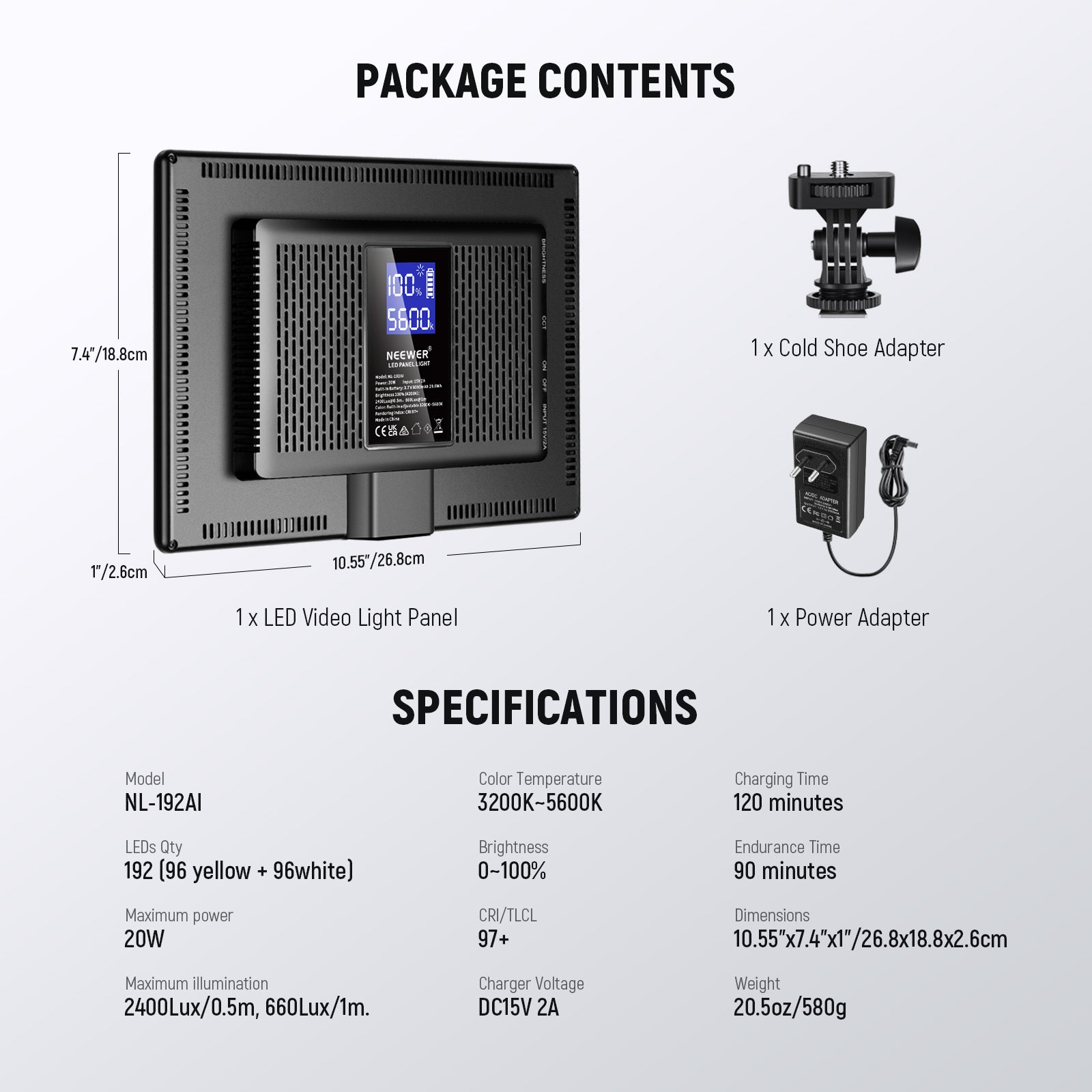 - Batteria al litio integrata da 8000 mAh e caricabatterie portatile - Integrata con una batteria al litio da 8000 mAh per un massimo di 90 minuti di illuminazione continua al 100% di luminosità. Puoi anche alimentare il pannello luminoso utilizzando il caricabatterie incluso (2 ore per completare la ricarica utilizzando la ricarica rapida da 15 V 2 A), garantendo un'alimentazione ininterrotta per tutto il giorno