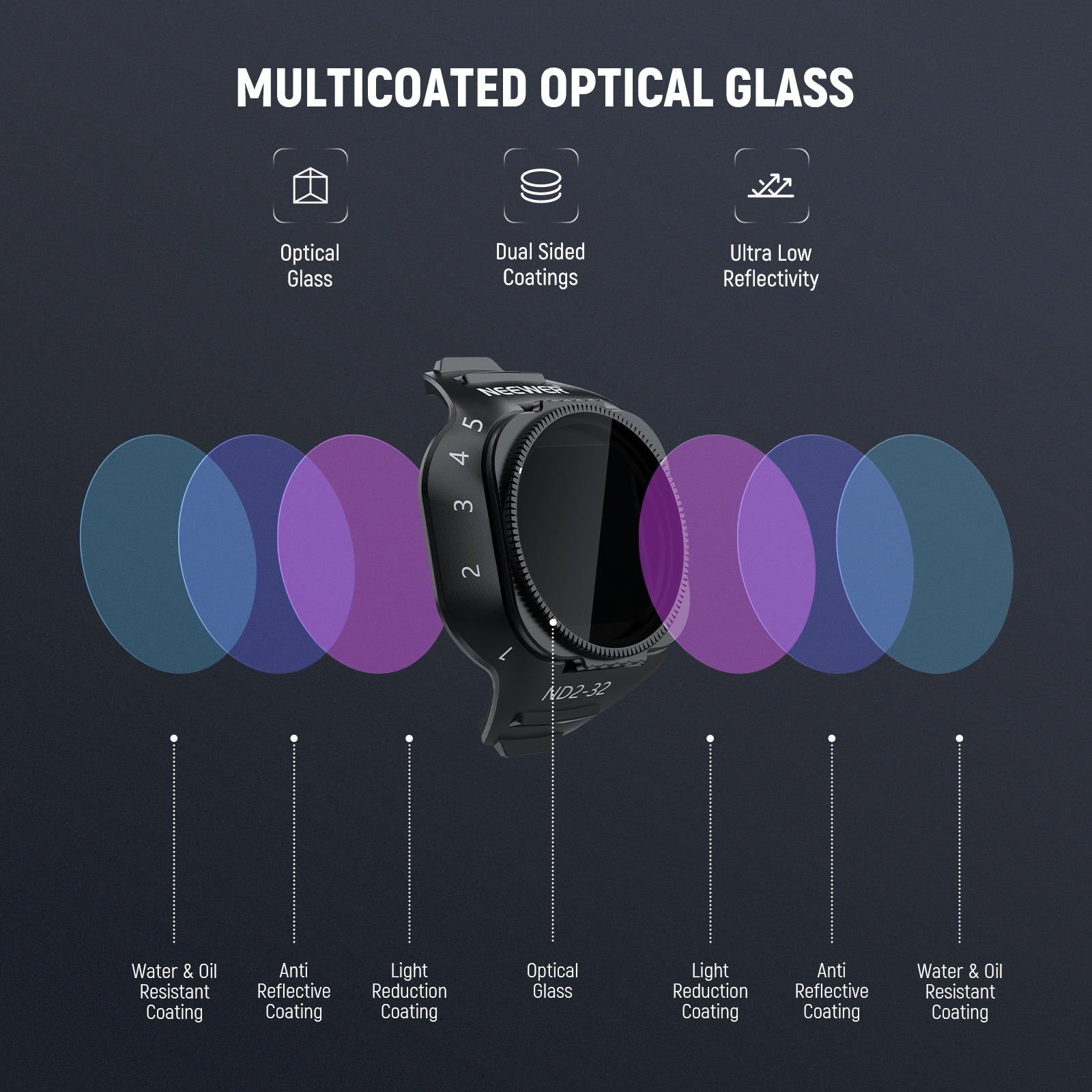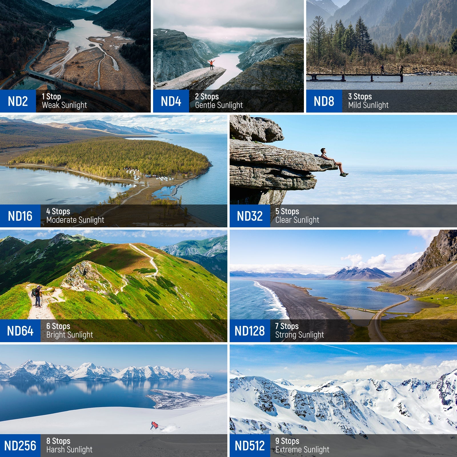 - Flexible Exposure Control- Variable neutral density filters (ND2-32 & ND64-512) reduce light by 1-5 & 6-9 stops respectively to prevent overexposure in different conditions and allow you to capture rivers, waterfalls, and light trails with dynamic motion blur