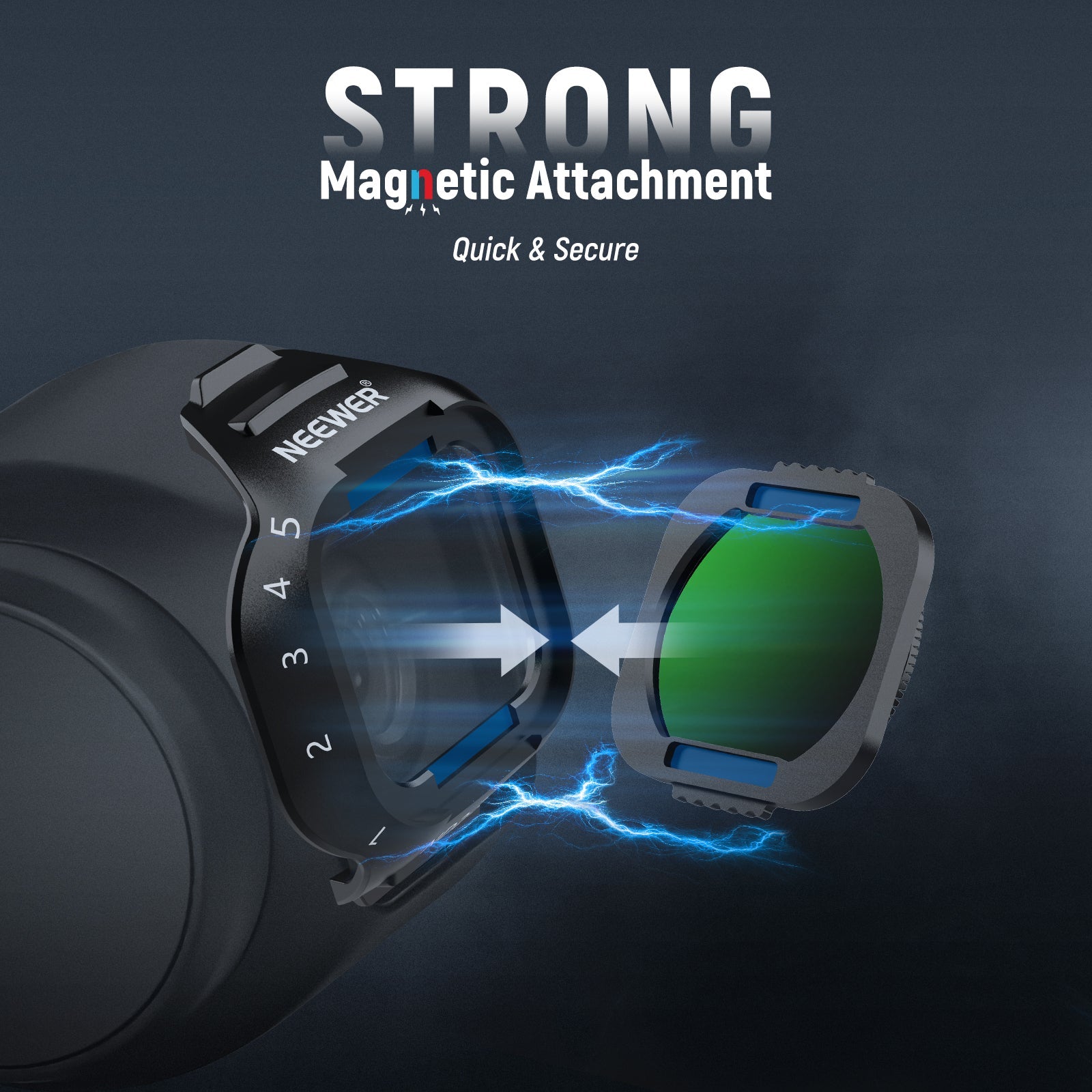 - Easy ND Level Adjustment- Rotate the frame to align with markings for precise neutral density value adjustment. With a detachable design, the filter and base can quickly combine and separate via magnets