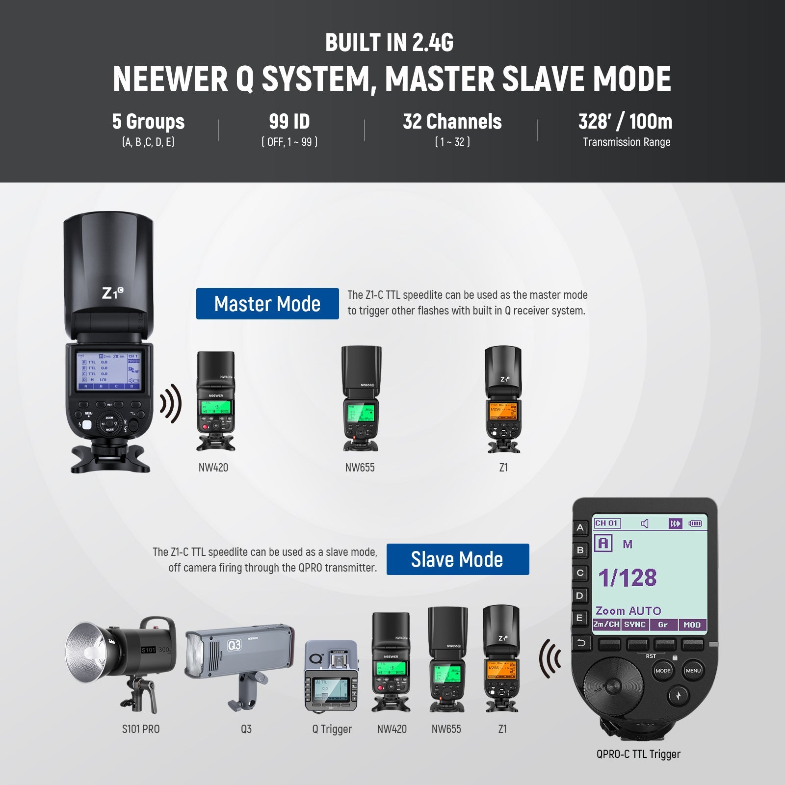 - Sistema Q wireless a 2,4 GHz: con 4 gruppi (A/B/C/D), 32 canali (1-32) e 99 ID (1-99) è compatibile con i trasmettitori TTL QC/QPro-C (non inclusi). Il flash può essere utilizzato anche come flash Master/Slave per controllare altri flash con un raggio di trasmissione fino a 328'/100 m (senza ostacoli). L'illuminazione della luce è uniforme e l'output è stabile, il che espande notevolmente le tue possibilità creative per la fotografia con flash. Inoltre, supporta gli aggiornamenti del firmware USB.