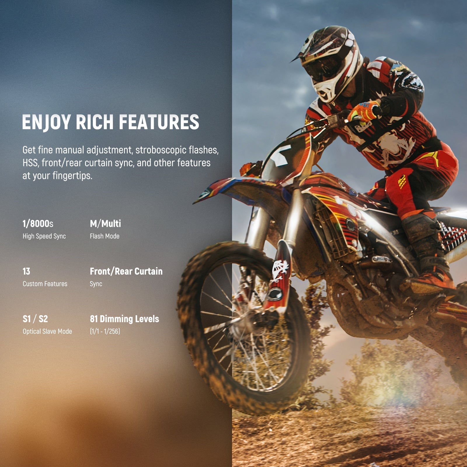 • Prestazioni avanzate - Dotato di una potente uscita da 76 W, offre modalità flash automatico TTL, flash manuale, flash stroboscopico e modalità slave ottica (S1/S2). Con la sincronizzazione ad alta velocità fino a 1/8000 e le opzioni di sincronizzazione della prima/seconda tendina, fornisce un controllo preciso sull'illuminazione. Goditi funzionalità aggiuntive come la compensazione dell'esposizione flash (FEC), il bracketing dell'esposizione flash (FEB), il blocco dell'esposizione flash (FEL) e altro ancora
