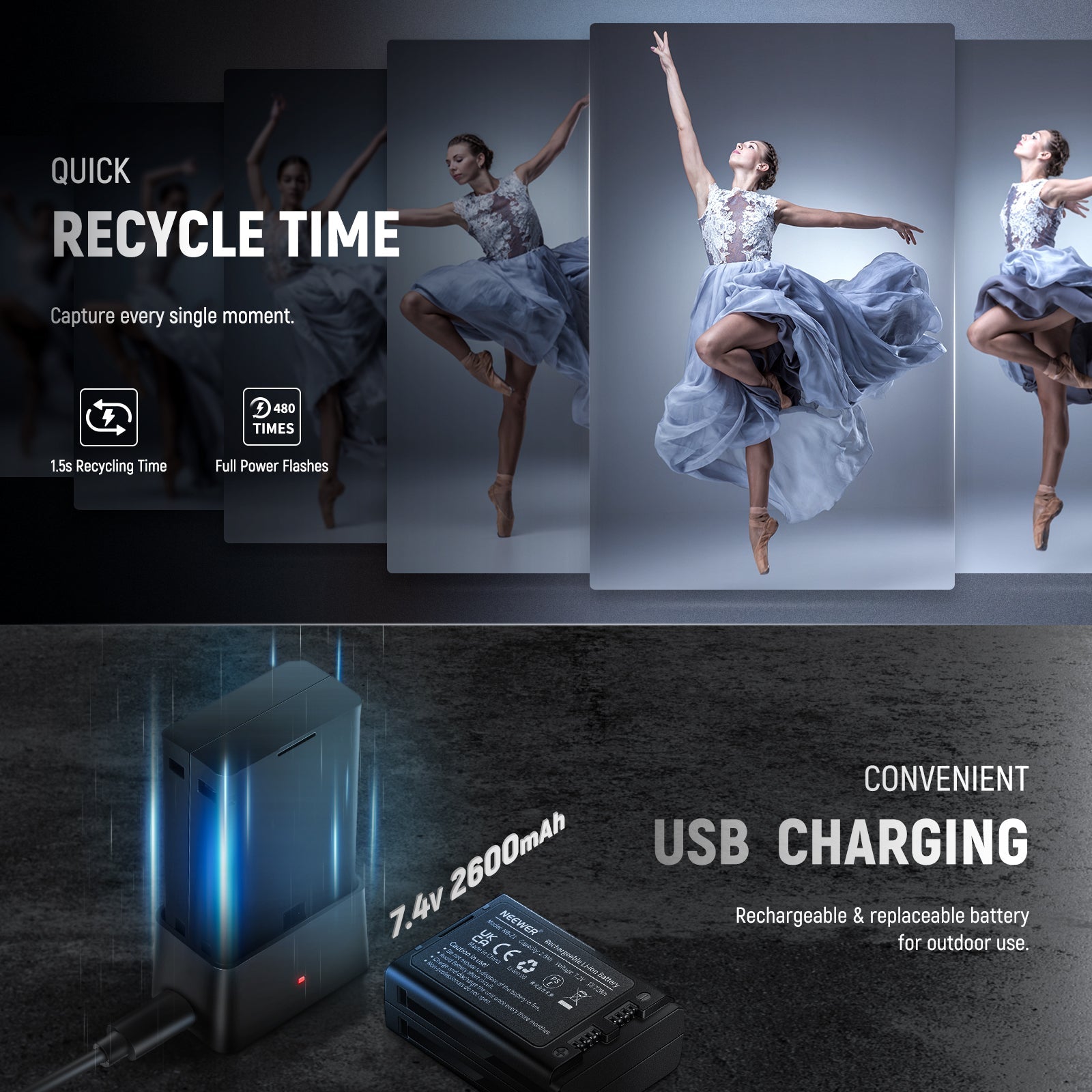 • Batteria ad alta capacità e rimbalzo flessibile : la batteria al litio da 7,4 V 2600 mAh (NB-Z1) fornisce 480 flash a piena potenza, tempo di ricarica rapido di 1,5 secondi e una durata del flash compresa tra 1/180 e 1/20.000, garantendo un'esperienza di ripresa migliorata. La testa del flash consente la regolazione orizzontale da 0° a 330° e la regolazione verticale da -7° a 120°, offrendo una versatilità di ripresa senza pari