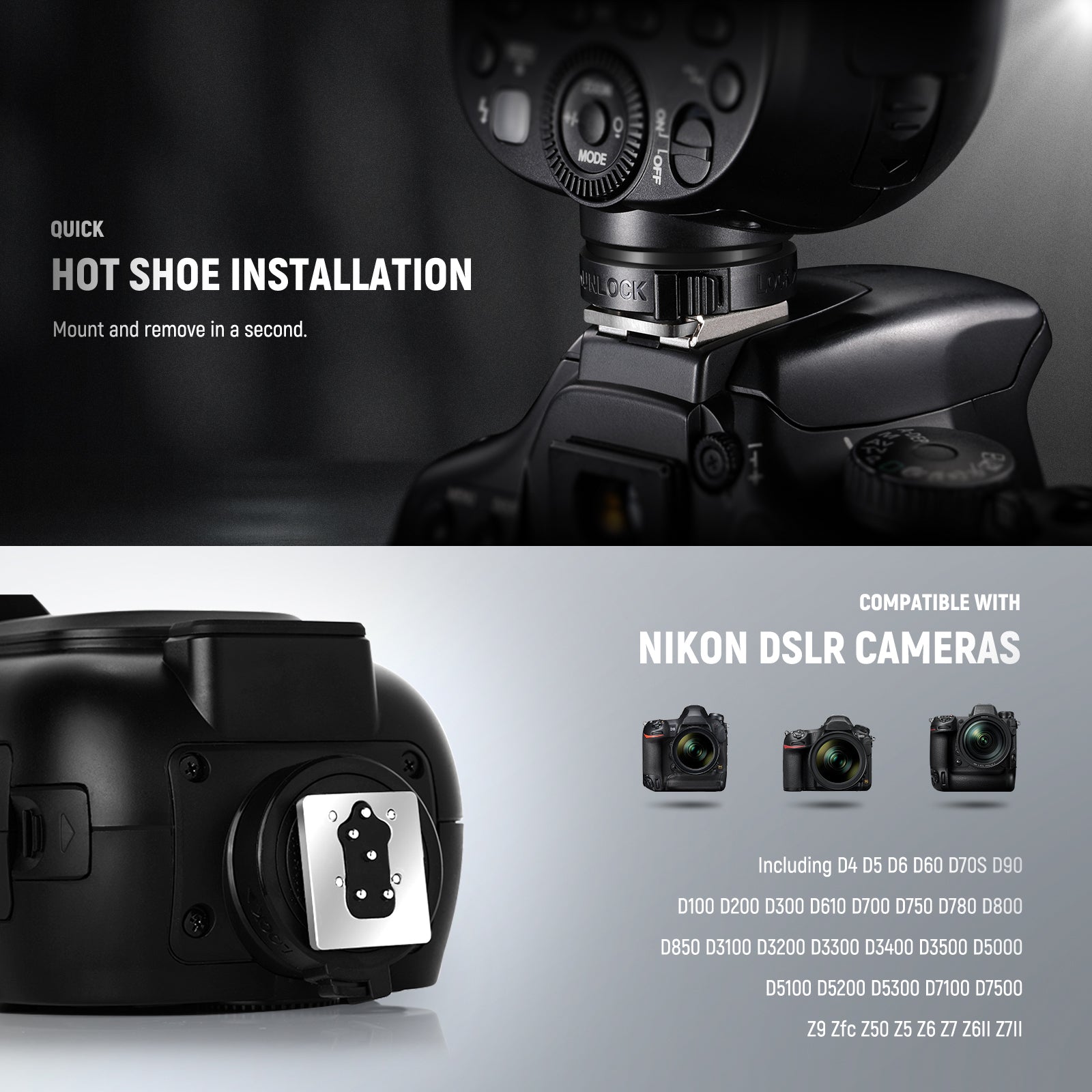 • Diffusore a cupola magnetica e ampia compatibilità : il diffusore a cupola ammorbidisce e diffonde la luce in modo uniforme, riducendo i flash e le ombre troppo forti. Il flash funziona anche con i kit GM-M1, CR-M2, AK-R1, tipo S2 e attacchi CRB1. Compatibile con Nikon Z9 Z8 Zfc Z50 Z5 Z6 Z7 Z6II Z7II D4 D5 D6 D60 D70S D90 D100 D200 D300 D610 D700 D750 D780 D800 D850 D3100 D3200 D3300 D3400 D3500 D5000 D5100 D5200 D5300 D7100 D7500 (NON compatibile con D810. Nota: il firmware può essere aggiornato se si verifica un problema di incompatibilità.