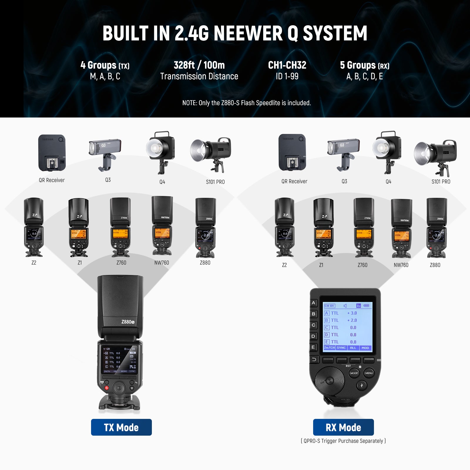 • Sistema Q wireless 2.4G integrato - Grazie al sistema NEEWER 2.4GQ, il flash dispone di 4 gruppi master (M/A/B/C), 5 gruppi slave (A/B/C/D/E, D/E per i trigger QPro), 32 canali (1-32) e 99 ID (1-99), compatibili con il trigger QPro-N (venduto separatamente) per il controllo wireless del flash. Può funzionare come unità master/slave per altri flash del sistema Q e consente la sincronizzazione wireless entro 100 m (senza ostacoli).