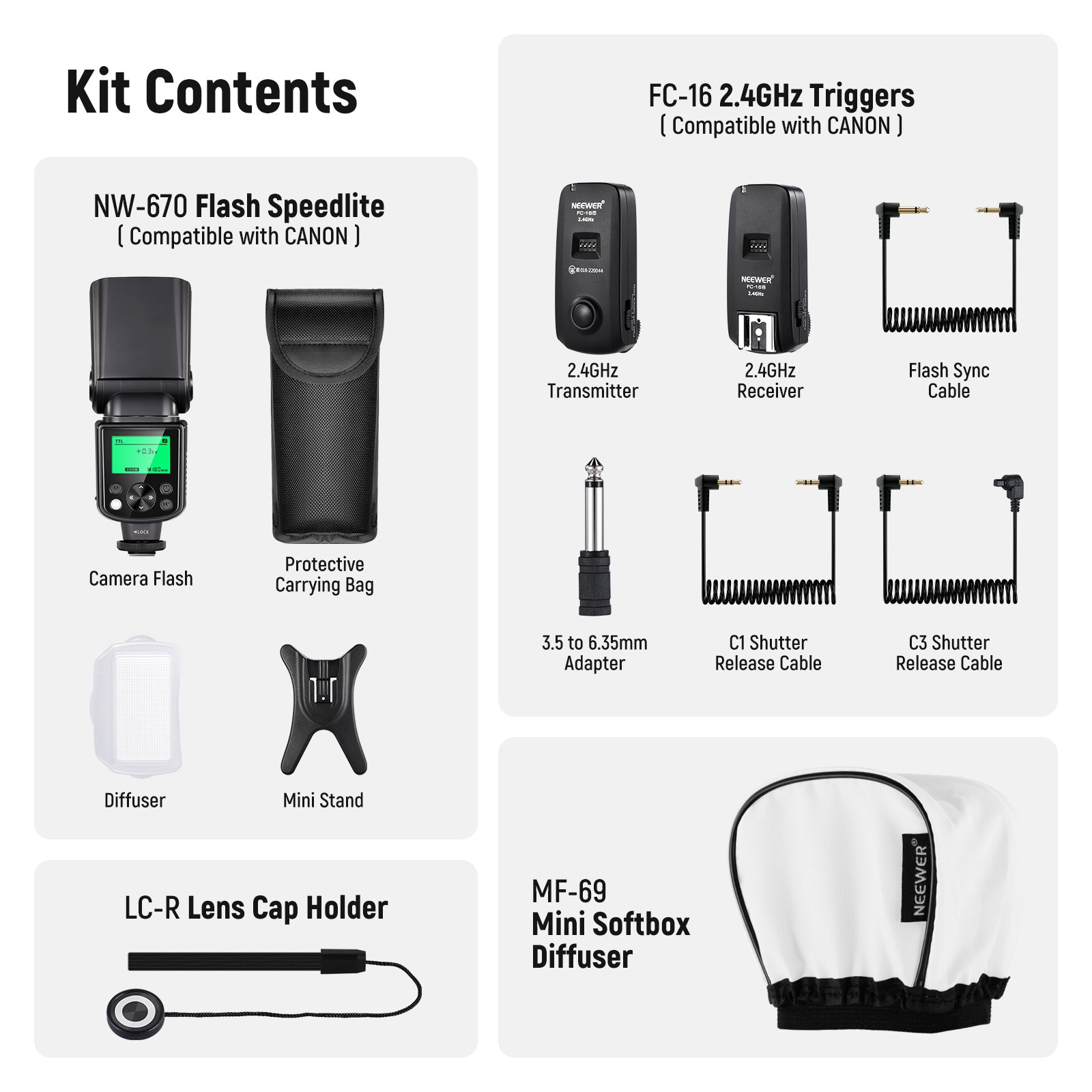 - Il Kit include: Flash NEEWER Pro E-TTL con messa a fuoco automatica + Trigger Flash Wireless 3-IN-1 per Fotocamera da 2,4 GHz con Funzione di Controllo Remoto della Fotocamera + 2 Cavi (C1-Cord + C3-Cord) per il Controllo Remoto + Diffusore Flash Duro + Soft Diffusore flash + supporto per copriobiettivo.