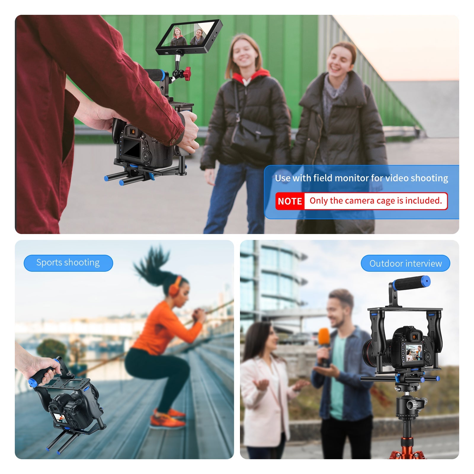 - Accessori completi: la gabbia della fotocamera è dotata di doppie impugnature ergonomiche per riprese stabili. La maniglia superiore in silicone può essere fissata alla gabbia della fotocamera per scattare foto dal basso. Inoltre, la base integrata a doppia asta con due aste da 15 mm di diametro e un calibro per asta da 60 mm consente di regolare le posizioni della fotocamera e montare accessori come follow focus, paraluce e supporto per obiettivo.